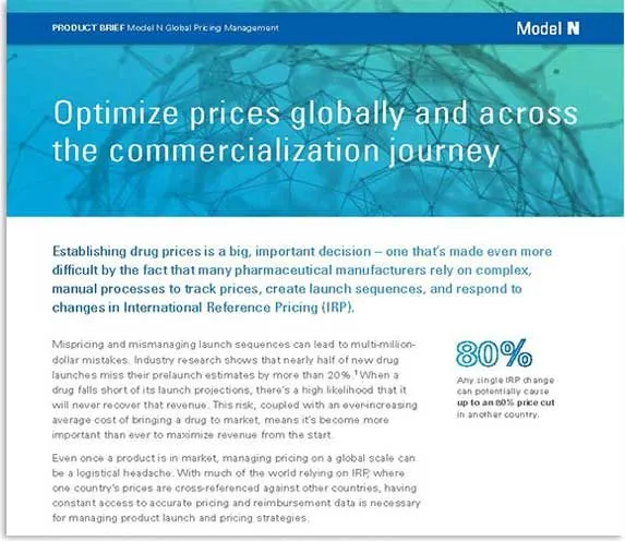Boost margins by optimizing product pricing across regions and reference ecosystems from launch through retirement. See how Model N and GPI offer the industry’s only end-to-end global solution that enables you to track and govern prices, optimize launch sequences, simulate reference pricing events, and achieve pricing success.
